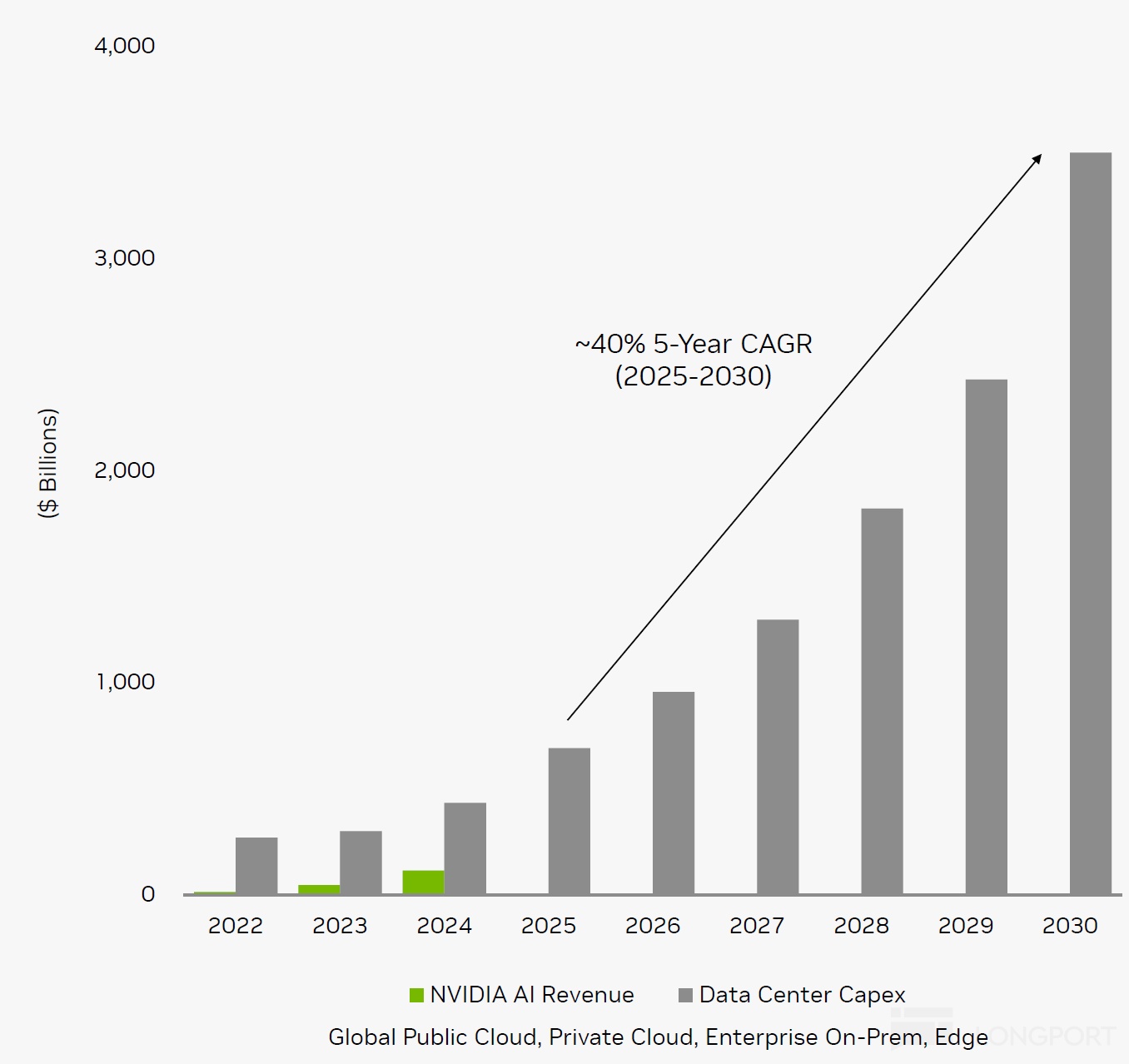 甚至在英伟达的自己对云服务资本开支的预测中,到 2030 年甚至要拉高到 3.5 万亿的资本开支水平。其实,就算这个水平上零增长维持五年,那把 2.4 万亿增量经济价值摊销到五年也没有意义。
