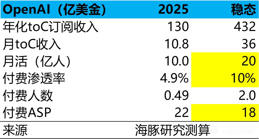 目前 ChatGPT 大约 8-9 亿 WAU,估算年化收入 120 亿美金;如果按照最终 20 亿 MAU(大约油管的用户体量),按目前 APP 的付费订阅率 10% 来毛估算,ChatGPT 稳态订阅收入可能会在 450 亿美金上下。