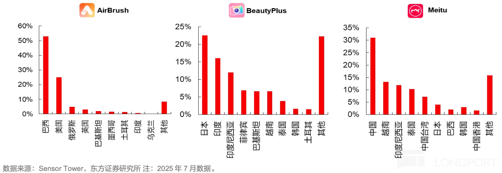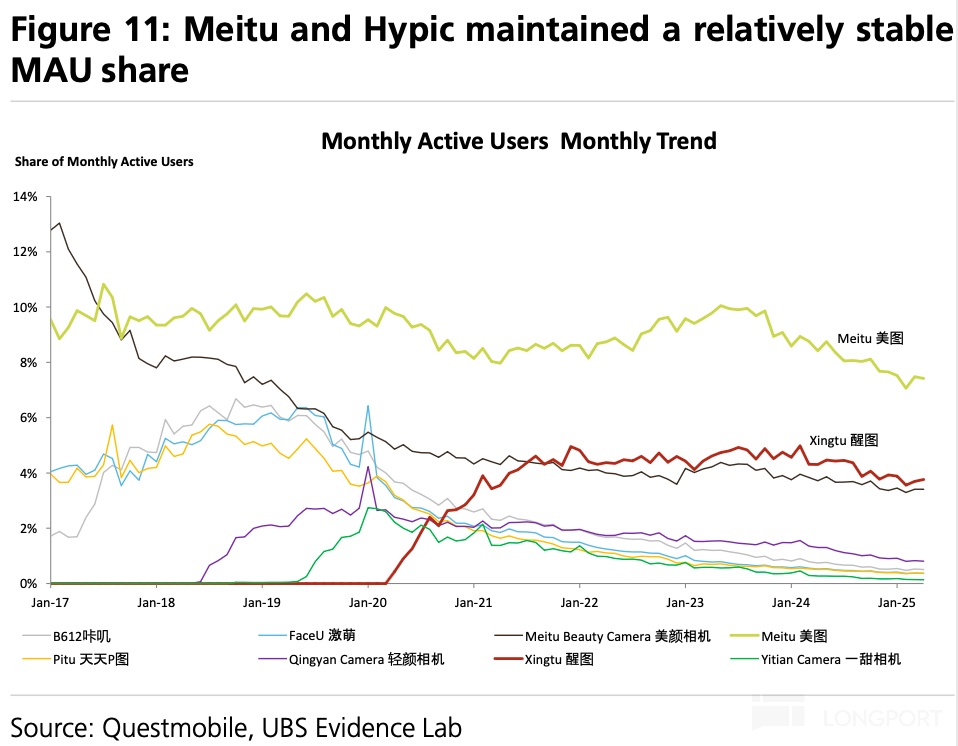 b. 而定位于 “实时美化” 这一垂直赛道的美颜相机,核心解决用户对 “无需二次修图” 的高品质拍照和录像需求,主要覆盖年轻女性自拍、视频通话、短视频创作场景,其月活指标远远高于其他竞品的加总。