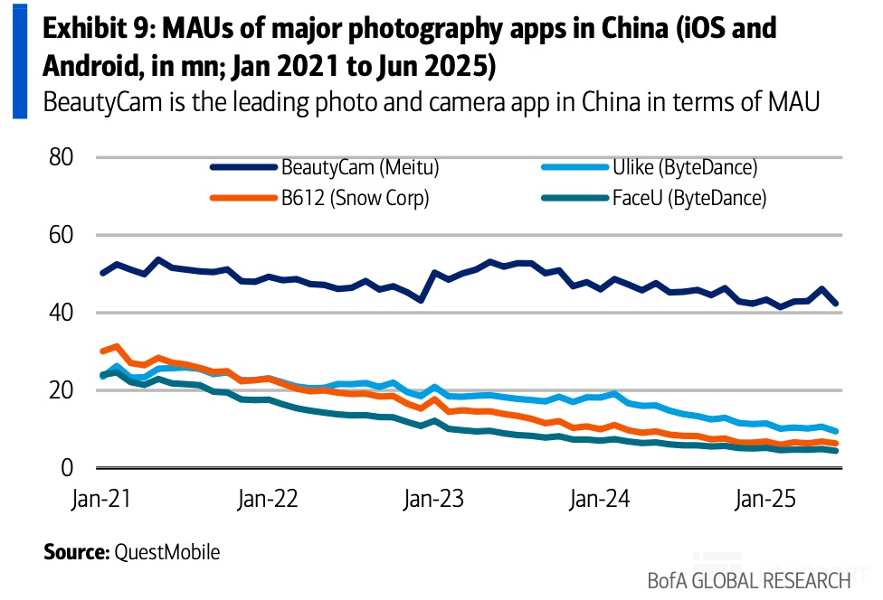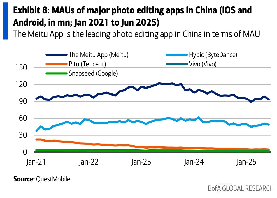 Sensor Tower 2025 年 8 月数据显示,美图系在北美市场 MAU 达 350 万,已超越竞品跃居第一;欧洲市场仅次于 FaceApp 稳居第二,显著领先于 Facetune。