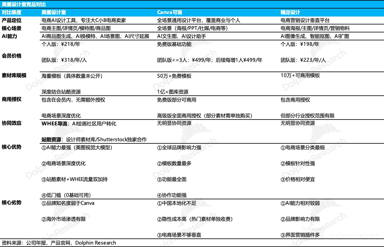 如前文所述,美图设计室依托 “站酷 +WHEE” 生态做 to B 端的变现。相比国际巨头 Canva 的通用化定位,美图设计室目前客户组要是大 C 小 B 电商卖家,凭借极具性价比的订阅价格与本土化海量素材,在 ROI 上具备明显优势;相比竞品稿定设计,美图在主要差一点是底层 AI 视觉大模型,与独家版权资源上的断层优势。