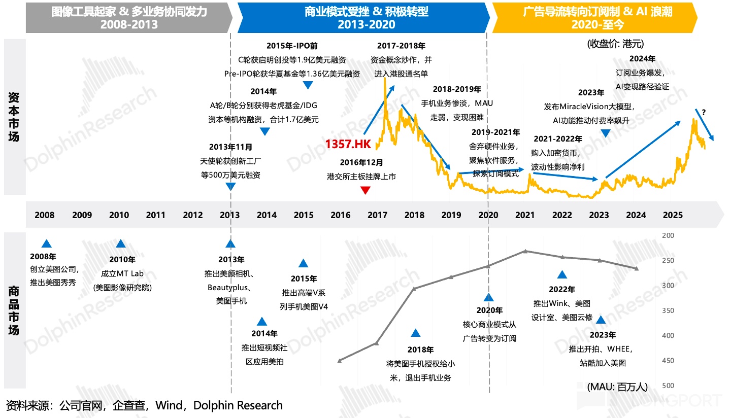 1)2008-2013 年 工具切入市场:美图公司于 2008 年推出美图秀秀 PC 版,以简单易用的特点迅速占领图片编辑市场。2011 年推出移动端应用,抓住智能手机普及红利,用户规模实现爆发式增长。2013 年起,公司启动海外市场布局,并扩张产品矩阵,陆续推出美颜相机、美拍等应用。