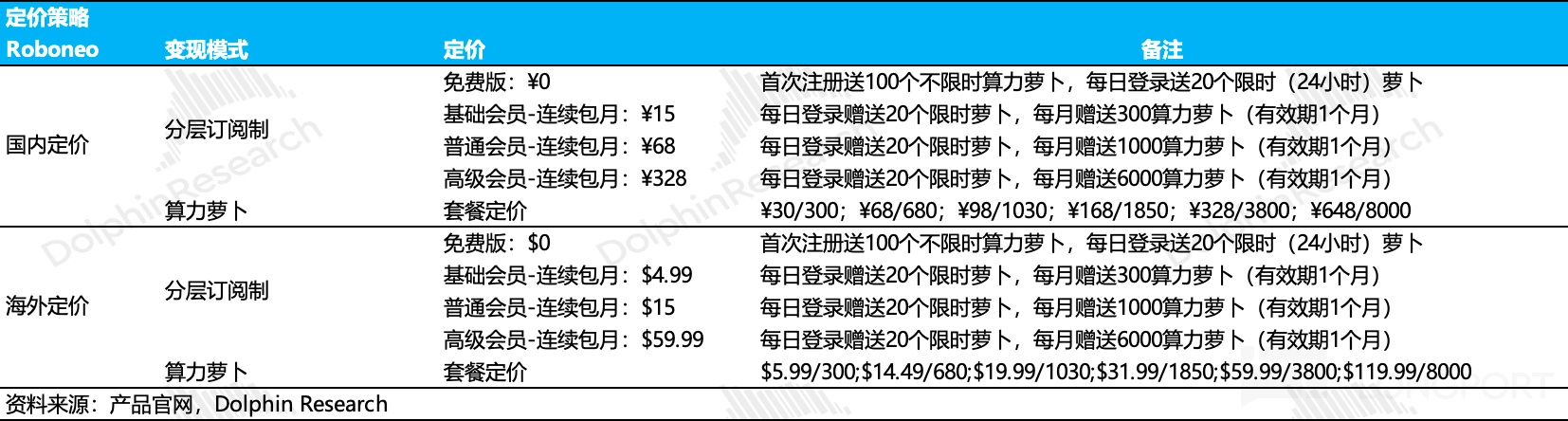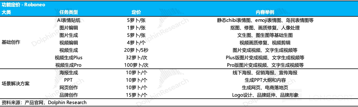 因此,海豚君判断,RoboNeo 短期的付费点主要体现在对顶尖模型调用权限的分发(整合进其他产品后无法自行选择模型)上,这对于追求效果的专业用户而言吸引力较强。