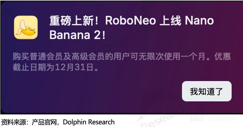 1)RoboNeo WAU 在 7 月推出,用户尝鲜后的留存效果并不好。如核心市场中国内地,上线不到一个月,to C 用户流失了 75%。而当 8 月最强竞品谷歌的 Nano Banana 上线,RoboNeo 翻身的机会似乎更加渺茫了。