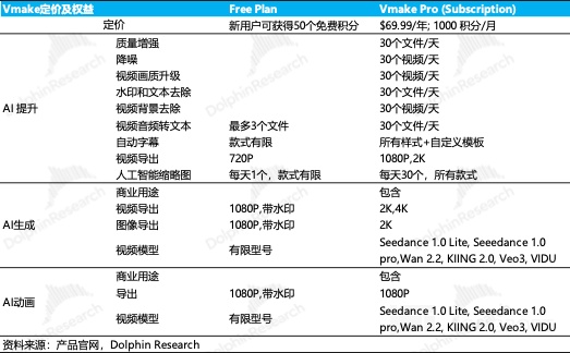 Vmake 基本付费才能用。免费版不仅被锁死在 720P 低画质与强制水印的非商用场景中,更无法调用 Veo 3 等高阶视频模型,且对许多功能进行了锁定。这种激进的权益区隔与 Vmake 更具生产力属性(海外用户多用 Web 端)相关,虽有 “劝退” 价格敏感型用户的风险,但只要功能体验足够好,总能吸引目标用户付费。