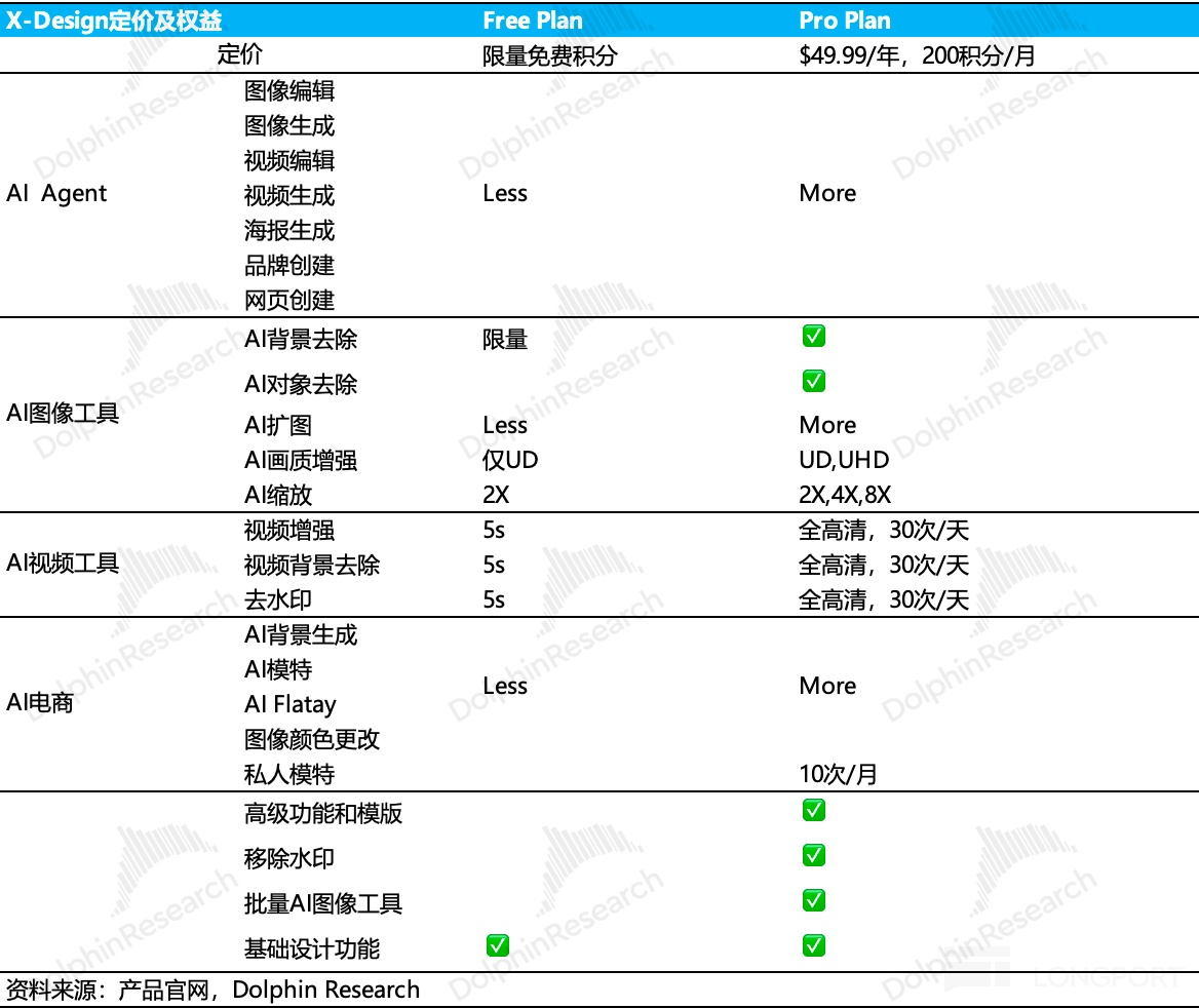 相较而言,X-Design 采取了低门槛获客的策略,其免费版本开放了更多的功能权益。这主要是为了应对其作为市场后发者的规模劣势(当前 MAU 处于百万级爬坡期,远低于 Photoroom、Pixelcut 等千万级竞品),其付费墙并非直接阻断功能,而是通过限制商用级画质、完整模板及批量处理能力来设置门槛。