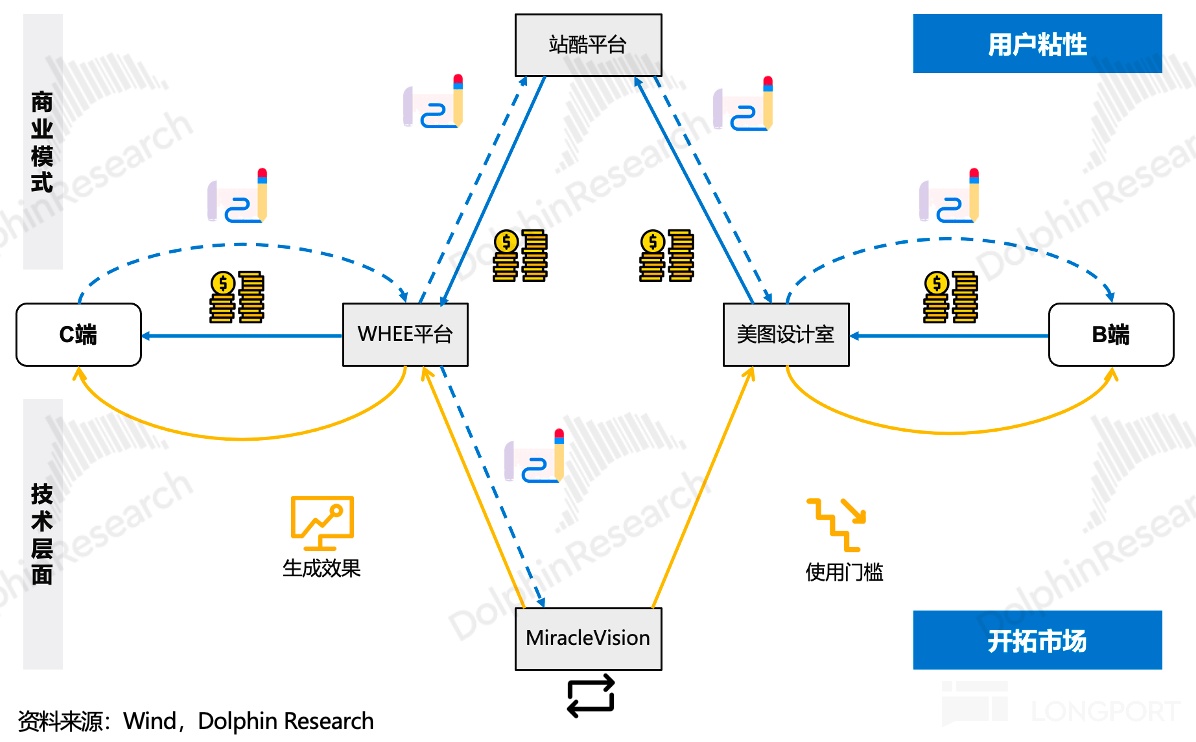 生态协同层面,WHEE 等美图影像产品的创作者可将优质内容上传至站酷海洛变现,美图设计室用户可购买这些素材进行商业设计,通过 Whee 创作者(生产者)——站酷数据库(素材平台)——美图设计工作室(需求方),把生产和需求串联起来了。