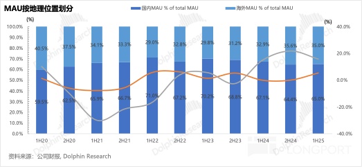 b. 尽管海外 MAU 同比增速受高基数影响,从 2H24 的 21.7% 峰值收窄至 15.7%,但仍保持着双位数的较高增长,占整体用户规模的 35%。海外渗透趋势在 1H25 出现收敛,增速与占比双重下修。