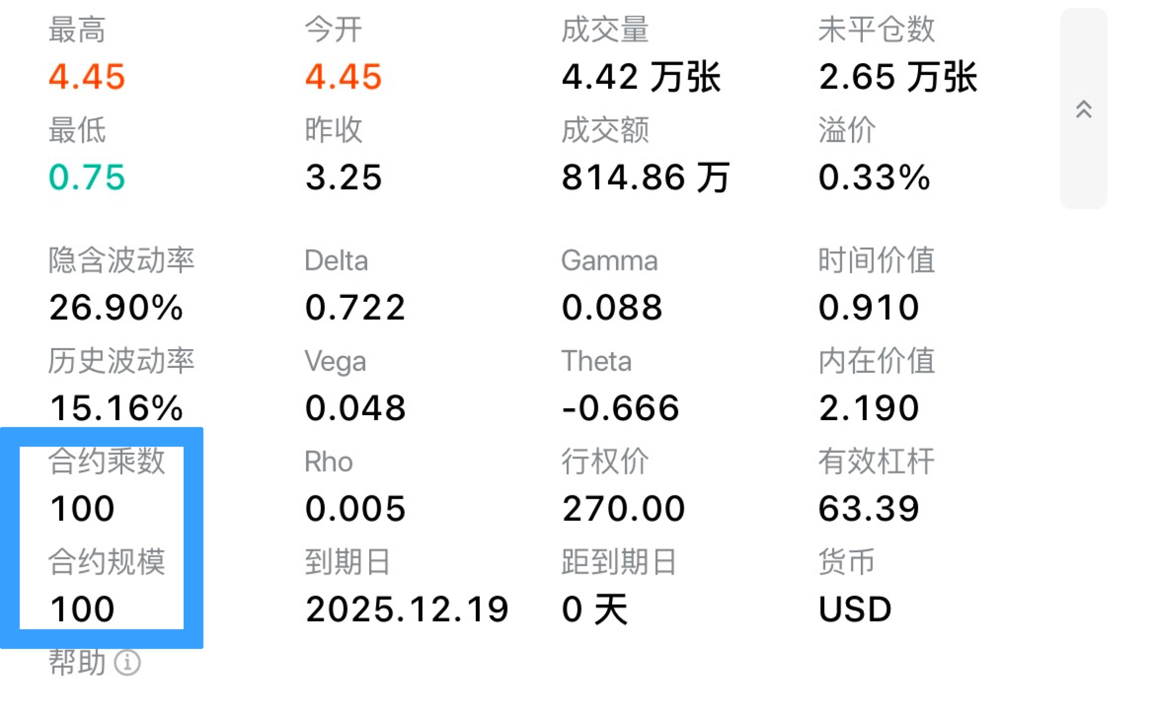比如一张 AAPL 期权通常对应 100 股股票,这就是合约规模。若当前股价为 270 美元,那么这张期权的 “名义价值” = 合约规模 100 股 * 现股价 270 美元=27000 美元。