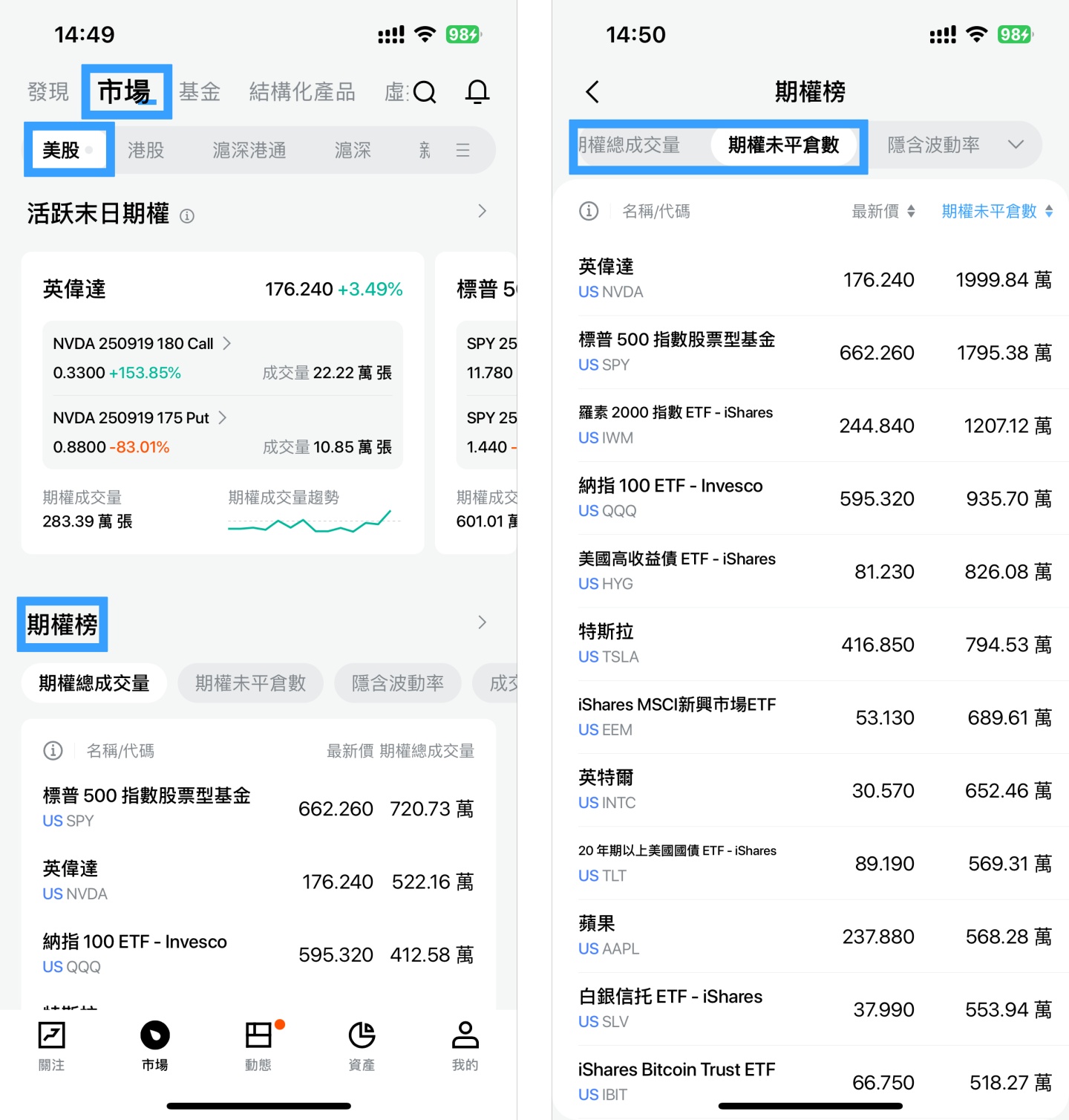 在期权榜里,可以按照成交量与未平仓量排序,方便锁定市场热点。