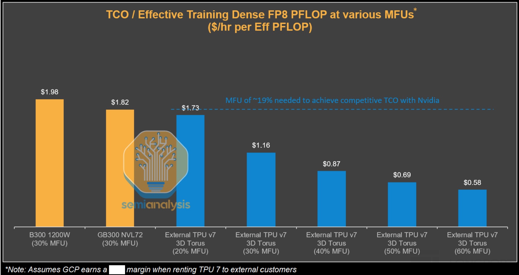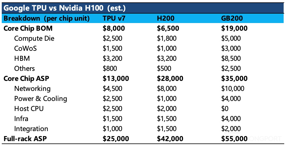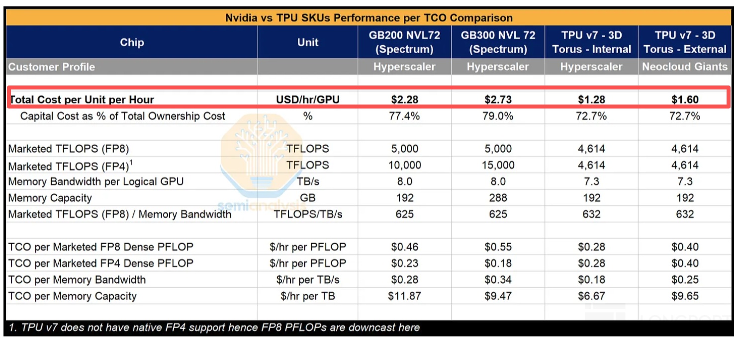 因此这种情况下,如果单颗系统级 TPU v7 价格再算上 Google 的溢价,那么就相对 H200、B200 没有明显的性价比优势了。