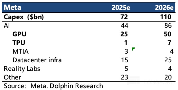 根据机构原来预期,Meta 2026 年 Capex 为 1000-1200 亿,近期 Meta 有意收缩元宇宙投入(约减少 30%)。GPU 原计划采购 100 万颗,大头为 GB200,另外为 V100。