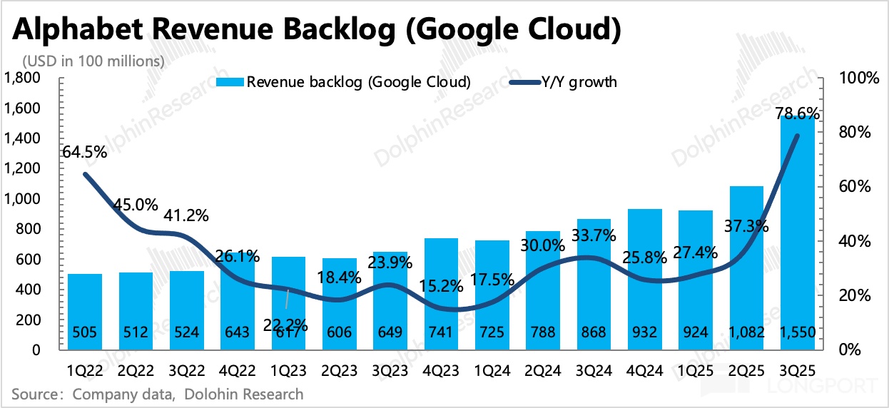 2025 年二季度,随着 TPU v7 的发布以及市场对 AI 的使用渗透升级,积压合同余额在高基数上重新加速增长,这里面应该就已经有了一些 TPU v7 带来的算力租赁增量。