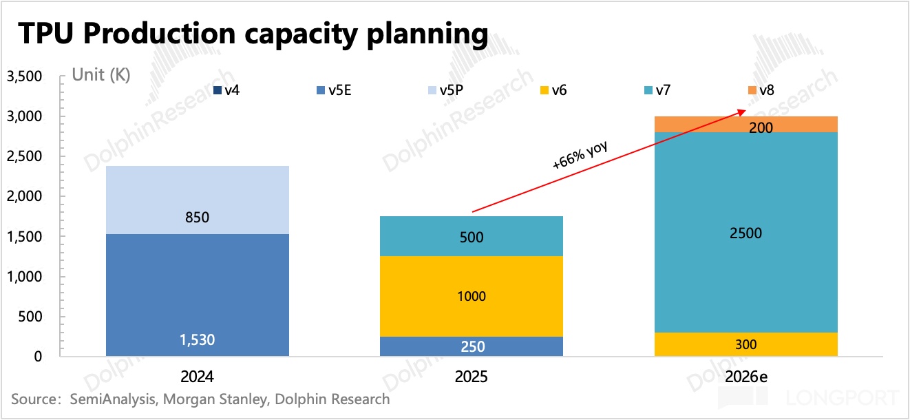 但前几天博通的 Q4 业绩发布,提到了 Anthropic 新下的一份 110 亿 TPU v7 订单,预计 2026 年底交付,按单价来算,那么也是对应 40-50 万颗的 TPU v7。因此如果能够按计划实现交付,那么 2026 年 TPU 出货量将至少达到 350 万颗数量级。
