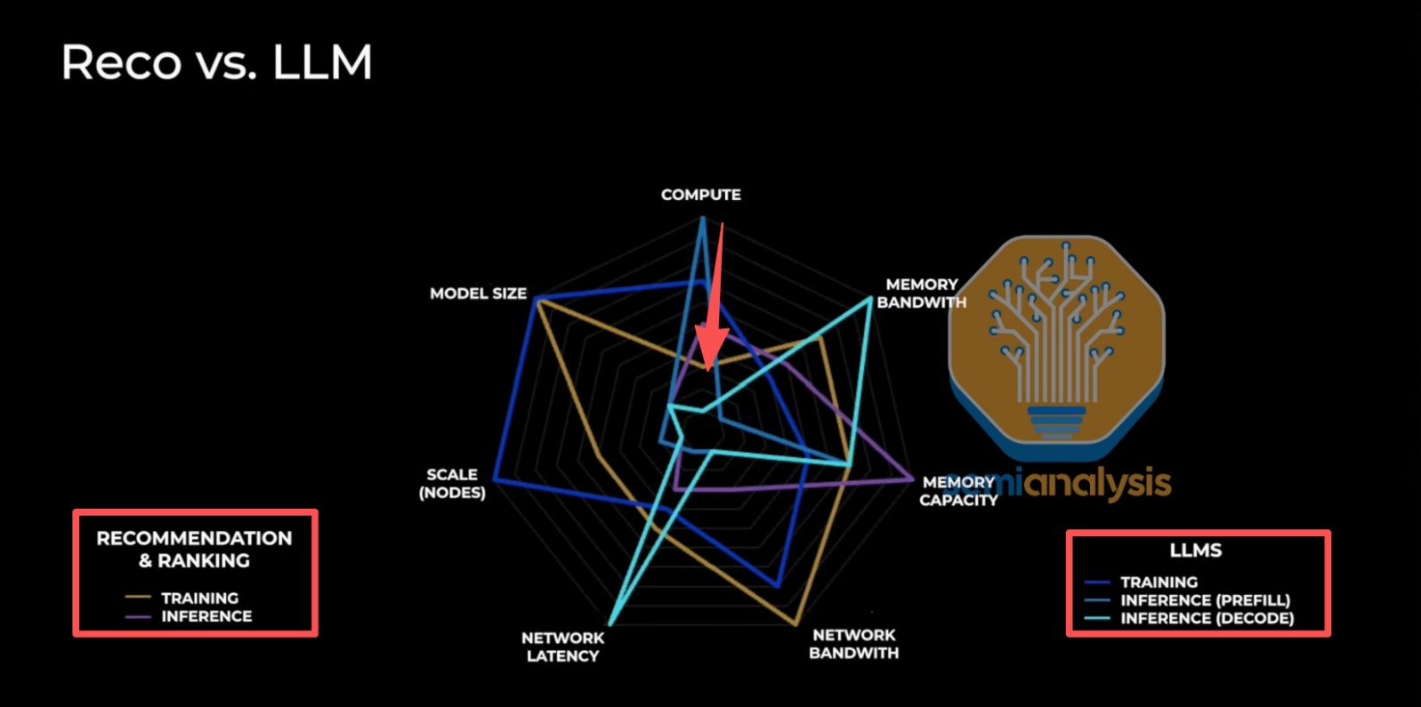 比如下图比较了广告推荐模型(Reco)和 LLM 大模型对硬件的性能不同需求,在 Reco 模型下,对算力吞吐、网络延迟上的要求没 LLM 那么高。