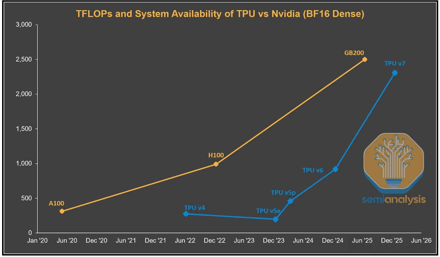 但随着 LLM 时代到来,算力要求大幅提高,集团在对 TPU 的设计思路本身需要升级改变。这个时候顺便对 TPU 开启直接商用,还能在当下的千亿算力市场分一杯羹,何乐而不为?于是我们看到,2024 年中推出的 TPU v5 版本在单片算力上出现了显著提升,并在随后的 v6、v7 版本继续大幅拉高。