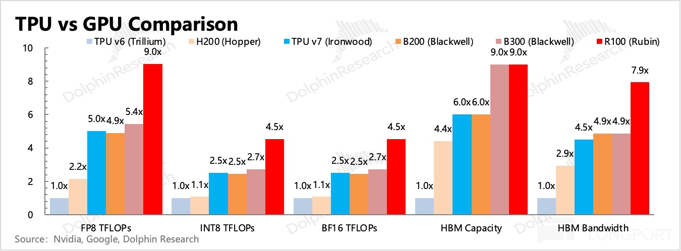 而在 LLM 另外需要的存储性能——内存带宽、内存容量上,TPU v7 版本直接拉齐到了 GB200 的水平,但单卡性能与 GB300 以及英伟达的 Rubin 系列还有明显差距。