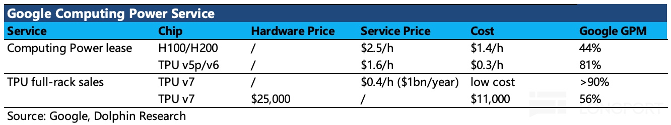 (1)GPU 算力租赁:属于 GCP 云业务;本质上是英伟达 idia 的二道贩子,自然毛利率最低只有 50% 左右,主要给那些技术能力较弱的中小厂商准备(不愿意用 TPU 编译器把基于 CUDA 写的底层代码重写一遍),承接一些外溢的算力需求。