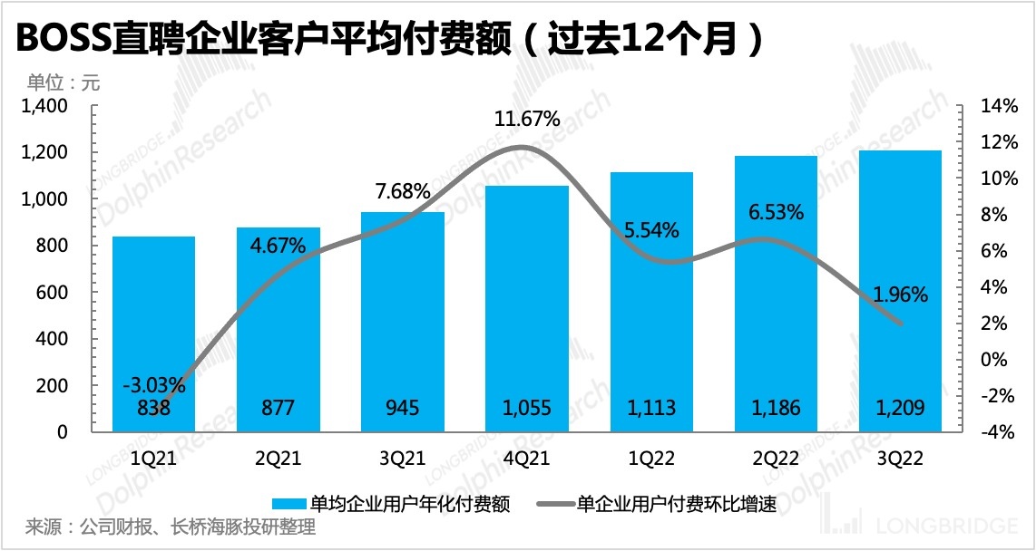 4)而以猎聘为首的传统在线招聘平台,则主要聚焦中大型企业客户,从 BOSS 直聘与他们的客单价差距就能看出两者客户类型分布的不同。比如上市的猎聘,2022 年上半年单个企业用户的付费 1.8 万元,而 BOSS 直聘单个企业用户年化付费水平刚到 1200 元。