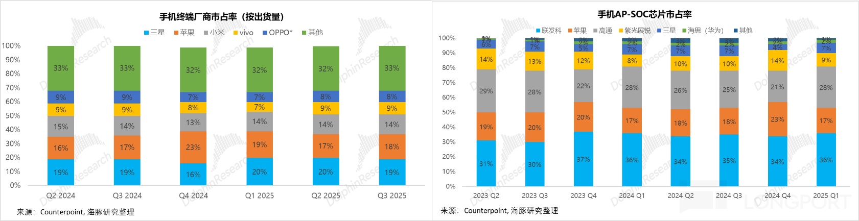 终端市场高度集中:全球前五大手机厂商合计占据了约 68% 的出货份额。