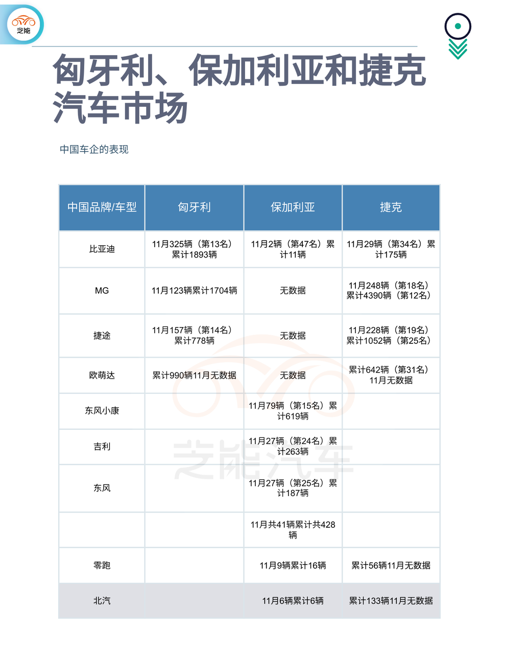 ◎ 捷克是三者中体量最大的市场,1–11 月累计销量约 22.7 万辆,同比增长 6.6%;