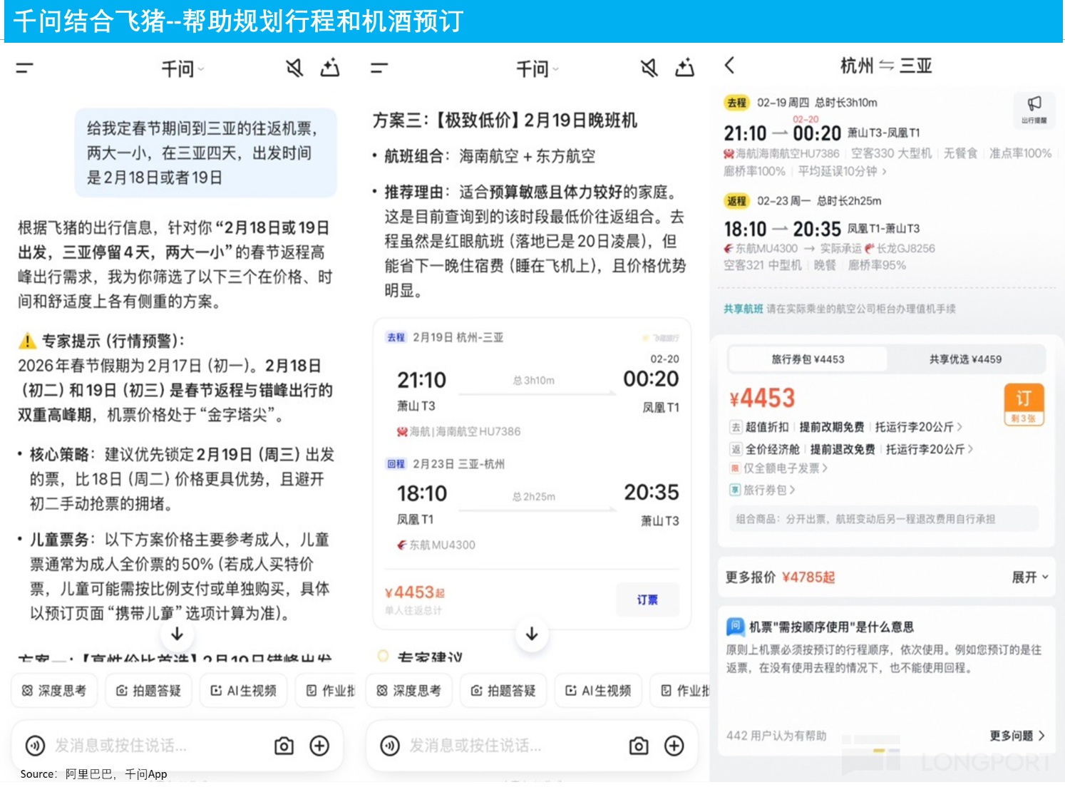 c. 千问的优势所在:显然,阿里和千问目前重要的优势是,阿里是中国互联网中 C 端消费业务布局最全的公司,电商、闪购、酒旅、导航/打车、商超、票务等等阿里都有自营。