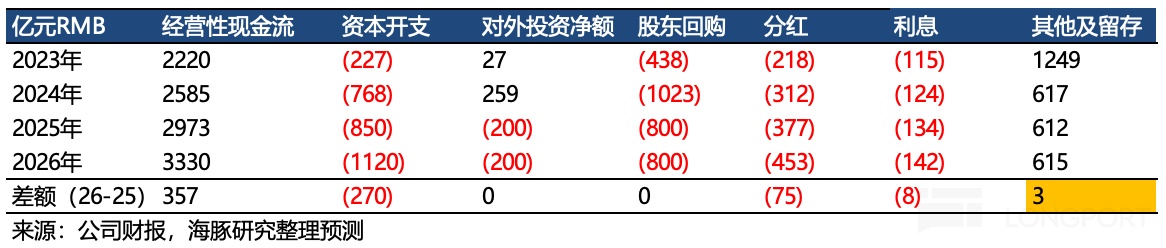 在没有额外必需的投资/运营支出计划的假设下,如下图我们类比 2024、2025 年「其他及留存」项的配置规模,测算腾讯在 2026 年的资本开支预算空间最高可以超过 1100 亿,同比增长 32%。这只是可用现金流角度,具体采购多少、确认到货多少,还得看实际供给情况。