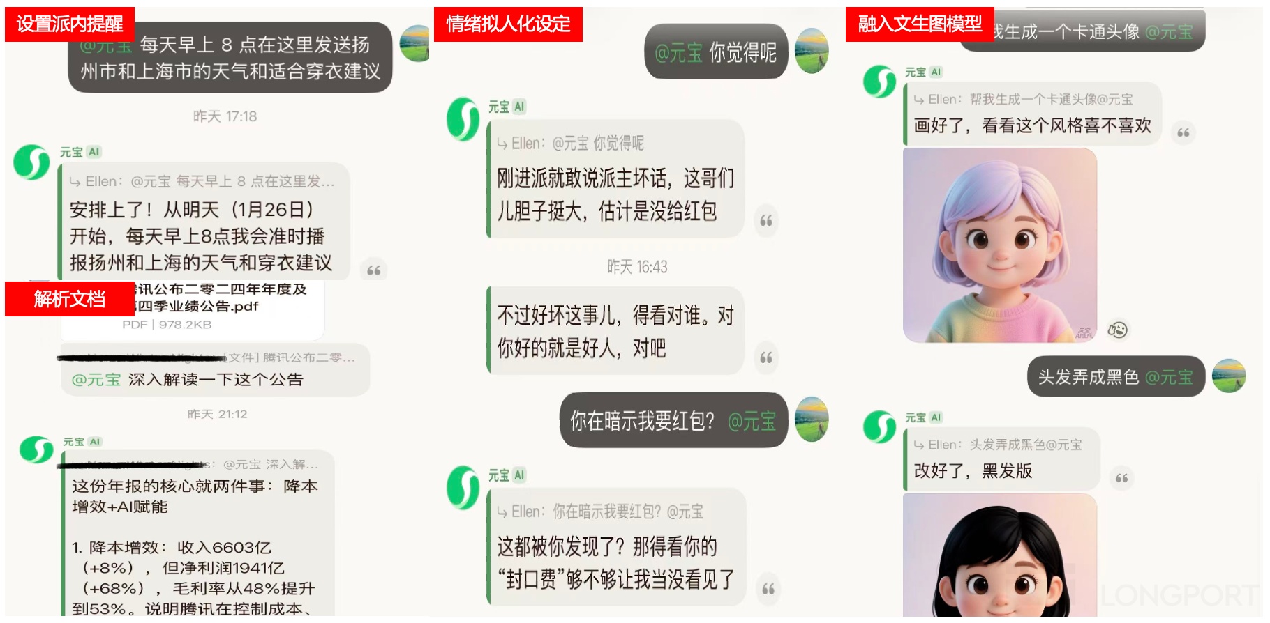 (3)元宝做出了 AI 社交,配以拟人化 NPC+ 生活助手融入用户社交场景,依靠微信多年积累的社交网络,基于同行都不具备的群聊数据、公众号数据,后续可以推出更 “懂” 用户的生活助手。