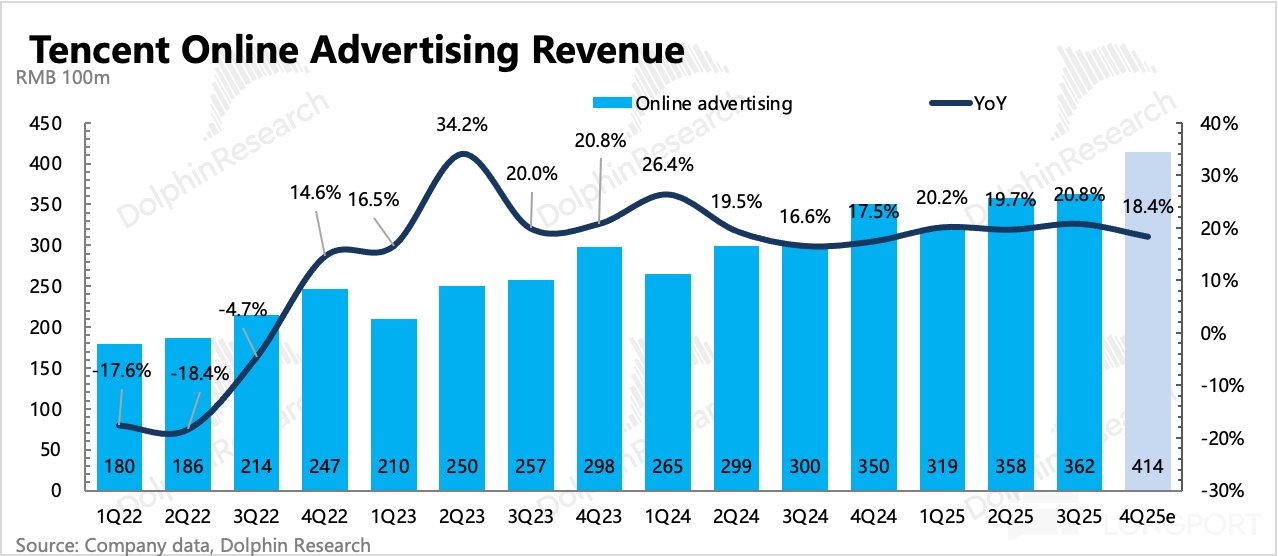 而广告的话,短期上市场应该比较担心投流税的影响,但海豚君认为 AI 带来的投放效率提升还未走完,具体体现在视频号、微信搜一搜以及 QQ 浏览器广告上。