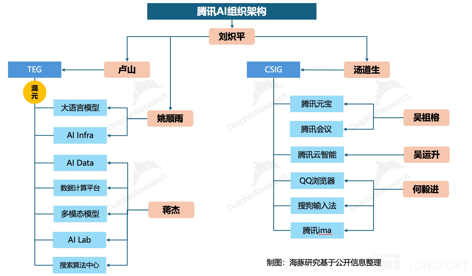 在 TEG 事业群下设大语言模型部和多模态模型部,其中多模态模型仍归为蒋杰管理,大语言模型部在 9 月等到了姚顺雨,随后与 AI Infra 部门一起由姚顺雨负责,姚顺雨与蒋杰一同向 TEG 总负责人卢山汇报。而为了进一步扫清获得集团层面的资源协助通道,姚顺雨将以首席科学家身份在职级上挂靠总裁办公室,直接向 CEO 汇报。