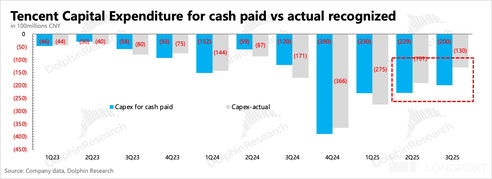 从资本开支实际现金流出和会计确认的差额变化来看,二季度就出现了 Capex 的现金流出大于确认额情况、且三季度差额更高,这说明并非腾讯吝啬花钱,而是钱预付了,但拿不到货。