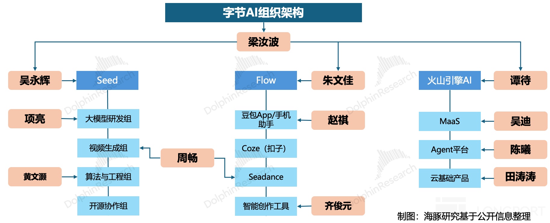Google Gemini 核心成员吴永辉于 2025 年初加入字节,负责带队 Seed(基础模型)部门,直接向 CEO 梁汝波汇报。而吴永辉之前,大模型的负责人是目前 Flow(AI 产品创新)部门负责人朱文佳兼任,朱文佳是推荐算法技术出身,在字节内属于奠定算法基础的老将之一。而在朱文佳之前,大模型的研究也是由学术派专家李航带头。
