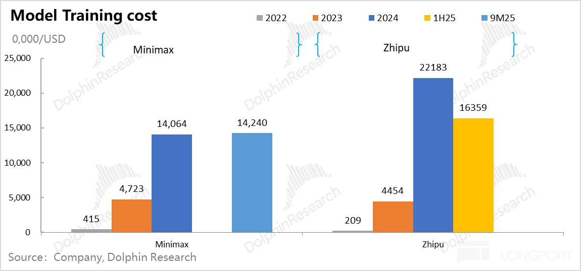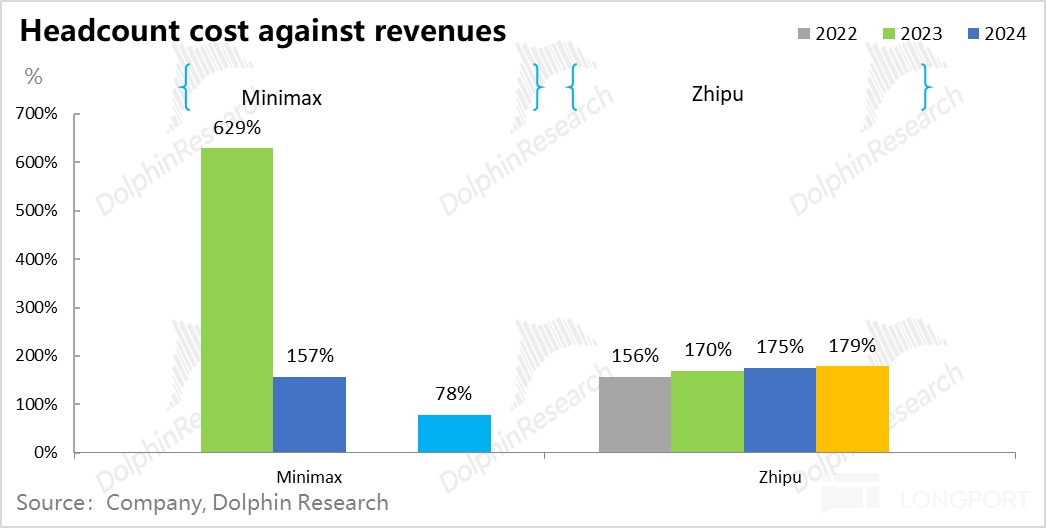 Minimax 因人员更为精炼,收入做大过程中,薪资支出至少已能够收入覆盖。而智谱因为商业变现上主要是 to B 落地,需要匹配更多销售人员;而且研发上对通用模型着力更高,所以人力成本改善并不明显。