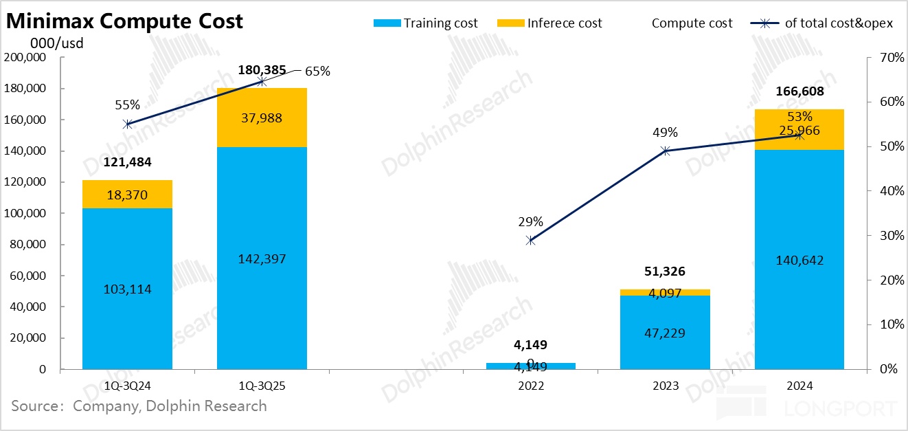 从 Minimax 来看,2024 年创收只有 23 年模型训练算力投入的 65%,25 年前三季度虽然收入成长很快,但也对 24 年同期训练算力成本覆盖能力反而进一步降低到了 50%;智谱到 25 年上半年更是仅有 30% 的覆盖率。