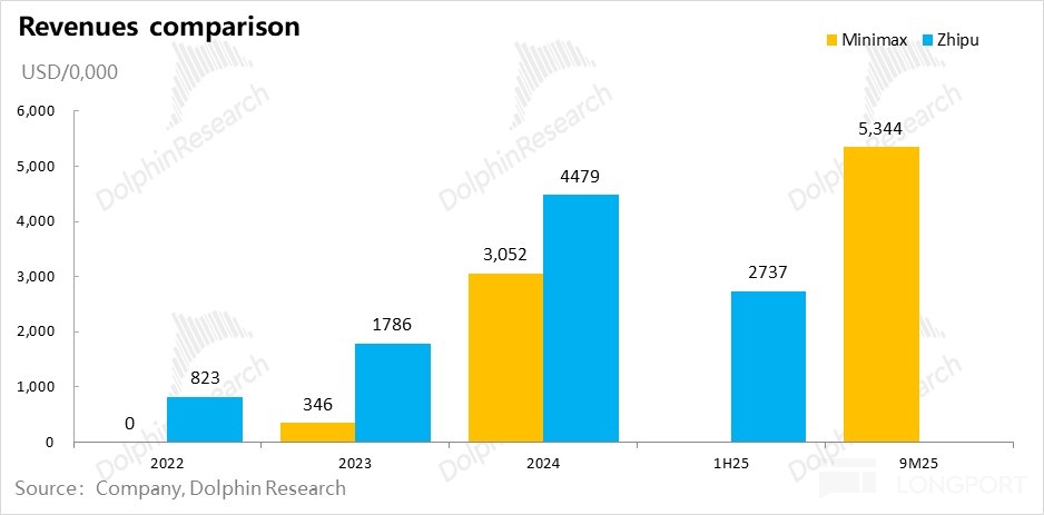 两个大模型公司 Minimax 和智谱,都是 “短小精悍” 型——人手少、产品迭代快,收入增长快。人数到 2025 年下半年没超一千人,收入零起步,两三年年化收入都在快速迈向一亿美金。