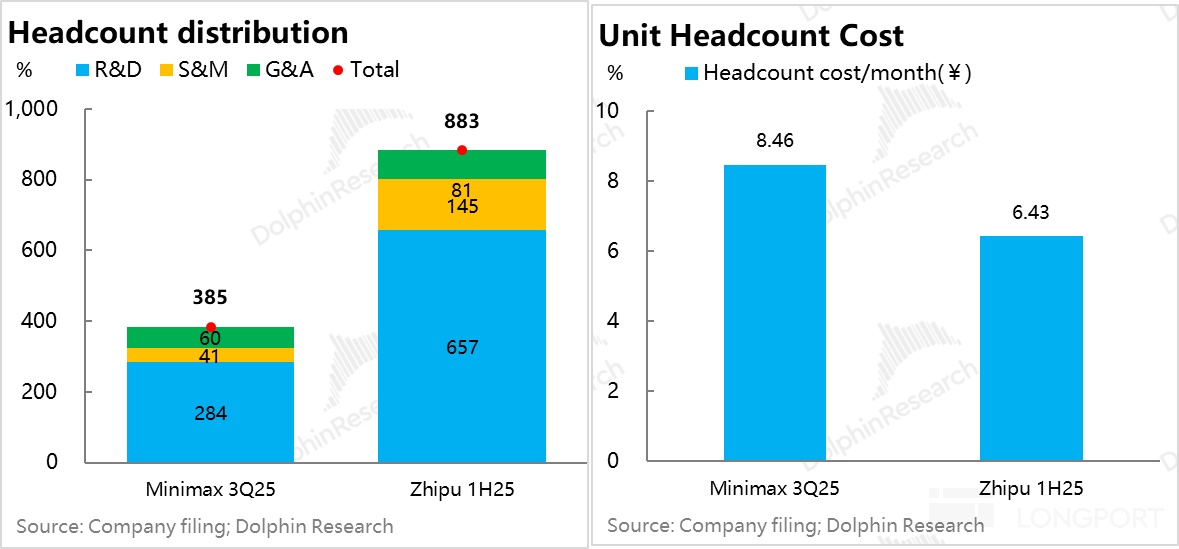 两个公司员工整体都没超 1000 人,尤其是 Minimax 都不足 400 人;两家公司研发人员都接近 75%,单人头月成本 6.5-8.5 万元人民币(不含期权激励),其中 Minimax 研发人员单人月成本是 16 万。