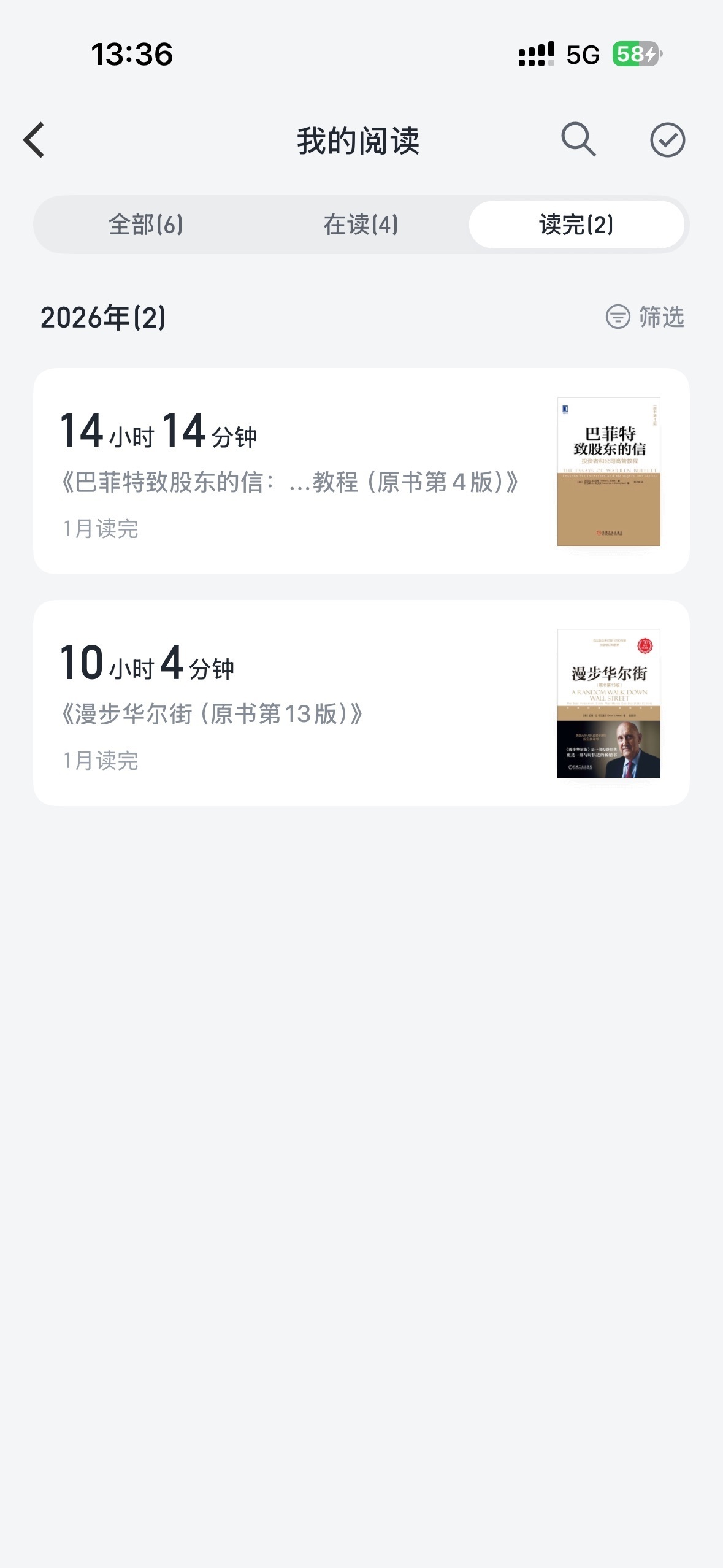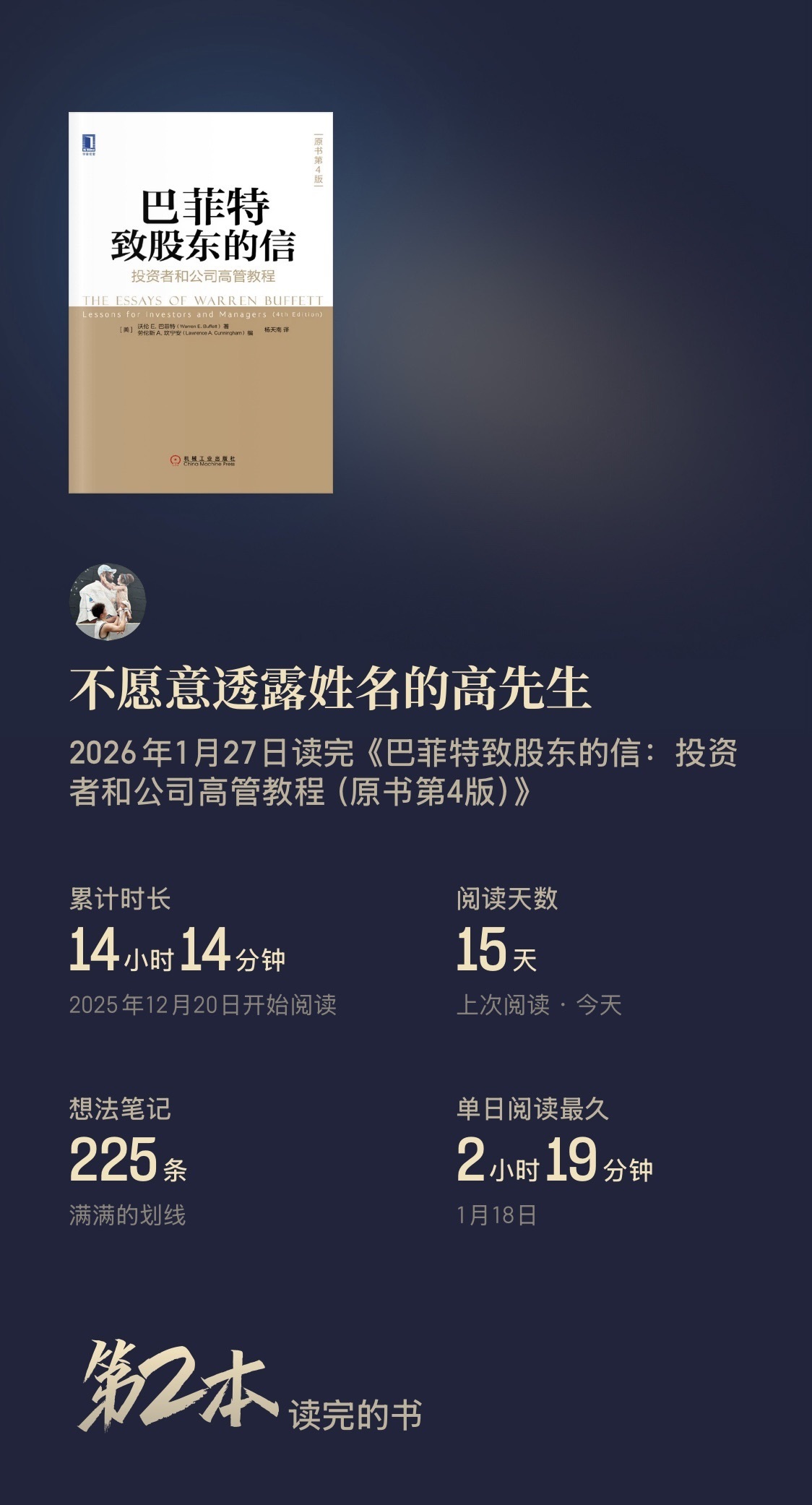 一月读完了两本书《漫步华尔街》《巴菲特致股东的信》,2 月目标还是每天读书 1 小时。只在意过程,结果是水到渠成。