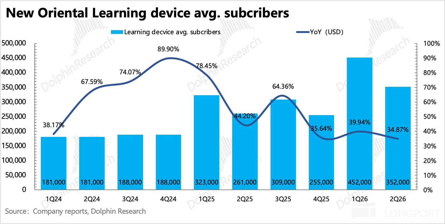3、新业务:增长如期反弹 21%。印证了上季度管理层所说的季节性影响。一般而言,中小机构为保证收益,一般主要做寒暑假旺季。二季度处于秋季学期,因此新东方面临的竞争会暂时下降。不过入学人次来看,增速继续放缓,隐含下季度不太可能继续维持增速,学习机同样存在略微的降速。