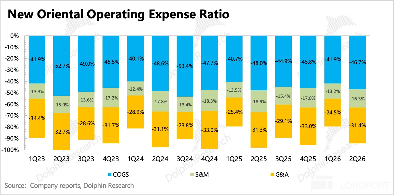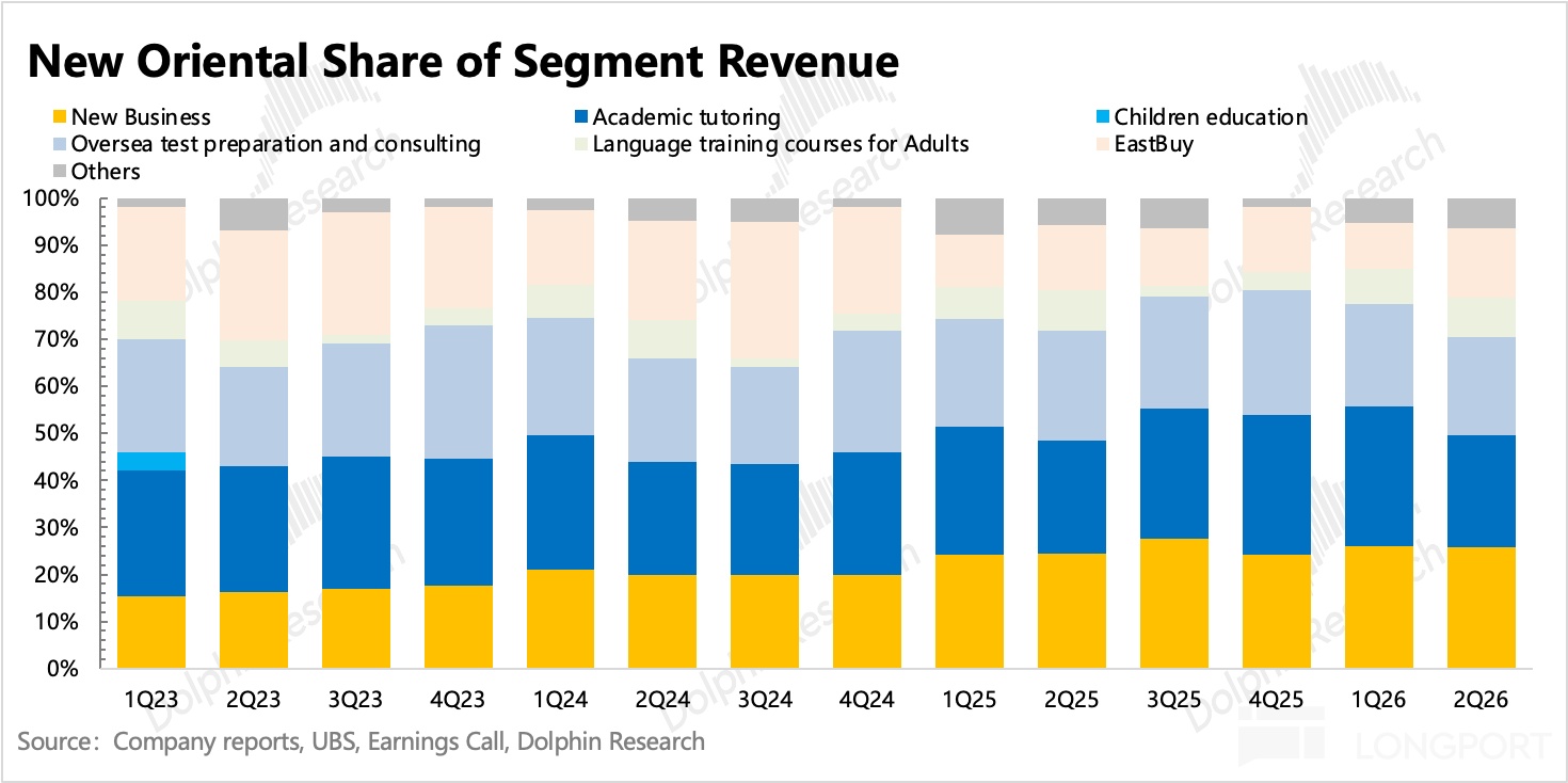 在 12 月的机构交流会上,管理层预计 2026 财年美国留学相关收入同比下降 10%,北美和英国地区合计应该是占到了海外留学咨询收入中的 60%,也就是占总海外营收的 60%*40%=24%。因此市场对 2Q26FY 和 2026 年全年海外留学收入的预期都是低个位数的下滑,但实际表现小超预期。