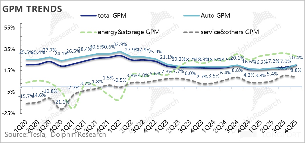 最终,虽然规模效应释放受阻,以及受关税负面影响加大,但可能由于美国政策补贴影响,特斯拉四季度的单车卖车成本反而在下滑,也带动了四季度卖车毛利率环比继续上行2.5个百分点至17.9%(去碳积分)。
