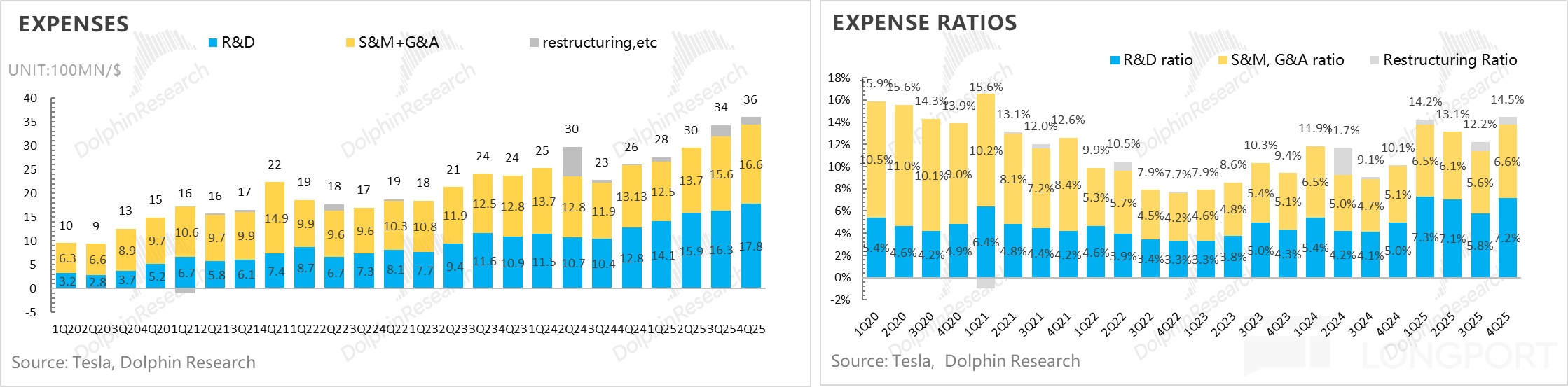④ 研发费用+资本开支的狂投都仍然在为AI的星辰大海业务买单:特斯拉本季度研发开支和销售费用又在继续加大,研发费用17.8亿,高于市场预期15.9亿,仍然由于AI智能化投入的继续加大,以及研发费用主要用于HW5.0芯片,Robotaxi和Optimus的投入,特斯拉指引研发费用支出在未来还会继续加大。