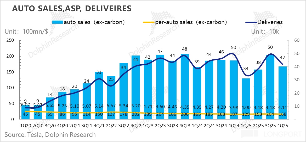 但由于Q4同样也有高价版推出(Model 3/Y的高性能全驱版),以及还有FSD订阅量上升对卖车收入端的贡献(FSD订阅量新增10万辆至110万辆),单价下滑幅度低于市场预期。