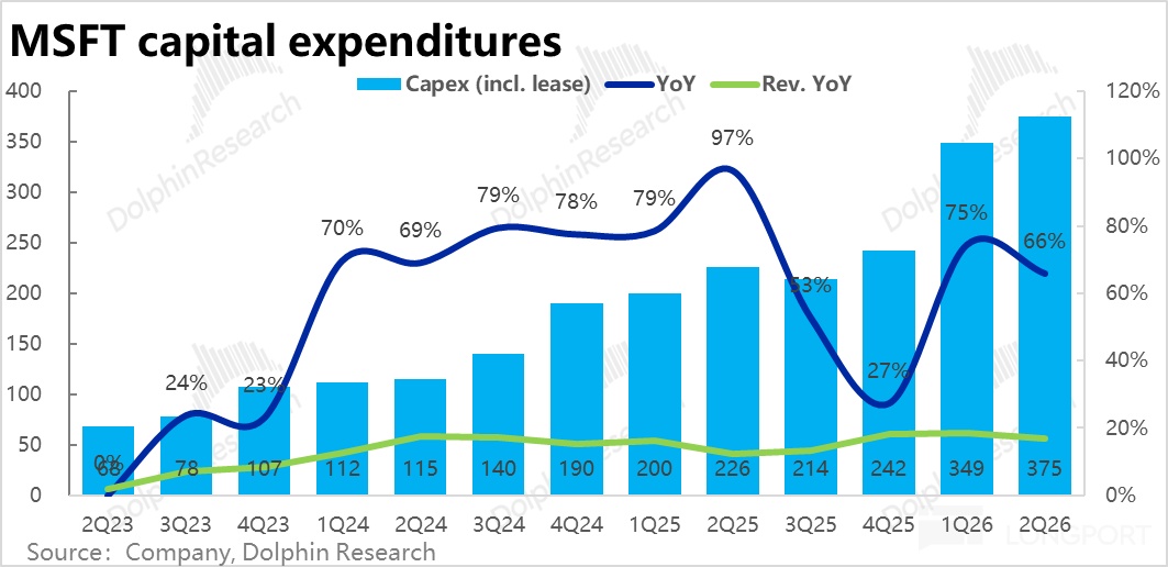虽然业绩前市场对 Capex(包括租赁)的预期已不低,约$359 亿,实际支出仍是显著更多,达到$375 亿,保持着比去年同期多增约$150 亿的快速拉升节奏。