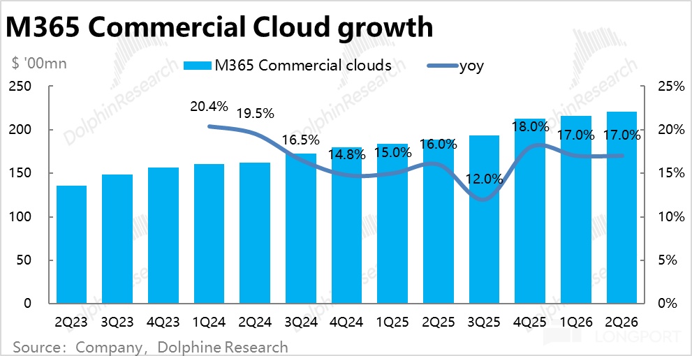 从量价角度来看,1)本季商用 M365 的订阅坐席数量同比增加 6%,和上季度持平;2)因此,隐含平均客单价的同比涨幅也大体维持在 10% 左右。