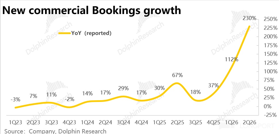 相比平淡的当季收入增长,本季公布的领先指标乍看之下相当炸裂。具体来看,本季新签企业合同金额同比暴涨 230%,在上季度时已相当夸张的 112% 的基础上再度翻倍。