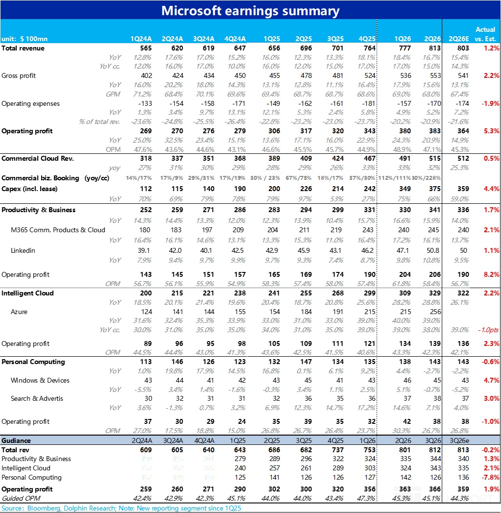 汇总上述各板块表现,微软集团整体本季度营收$813 亿,同比增长 17%,略高于卖方一致预期 1.2%。