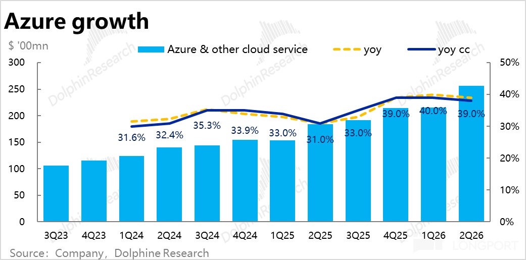 1、Azure 增长不升反降:最受关注的Azure 业务,本季营收同比增长 39%,剔汇率影响后增速则为 38%,两者都较上季有 1pct 的降速。
