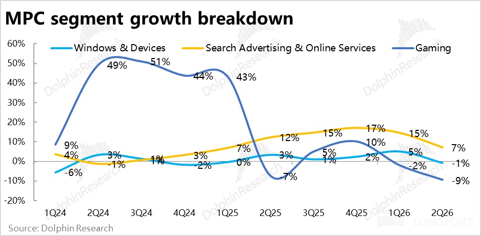 4、个人业务比较疲软:本季传统的个人业务增长比较弱,营收增速再度转负,为-3% yoy。具体来看,主要是硬件销售较差,包括 Windows 业务线内的 PC 设备,和游戏业务线内的主机硬件。而此季度内,内存涨价的影响应该还未充分传导,可见电子产品的需求是较弱的。