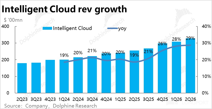 整体上,本季智慧云板块收入$329 亿,同比增长 29%,相比上季反提速 1pct。可见虽然 Azure 小幅降速,但其他传统业务有一定改善。