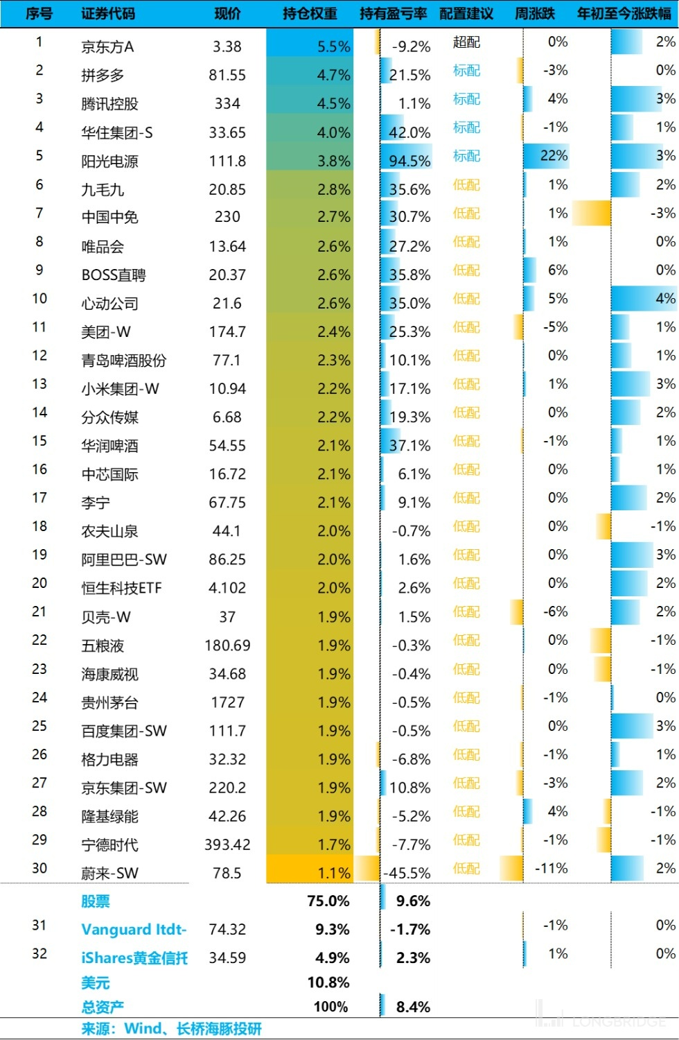 调仓之后,目前组合共配置了 30 只股票/股指,其中超配一只,标配 4 只,低配个股为 25 只。截至上周末,Alpha Dolphin 资产配置分配和权益资产持仓权重如下: